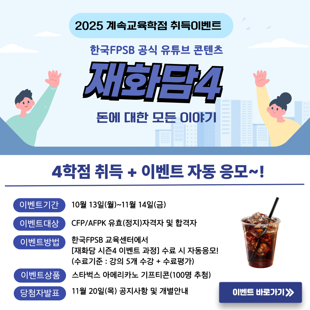 ■ 참 여 방 법 : 한국FPSB 교육센터에서[재화담 시즌4 이벤트과정](바로가기)을 수료 하면 자동 응모